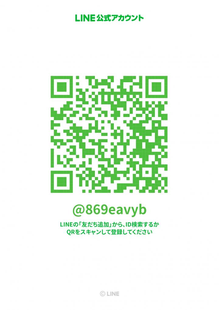 LINE ID: @869eavyb 又は画像のQRコードを読み取りでもOKです。